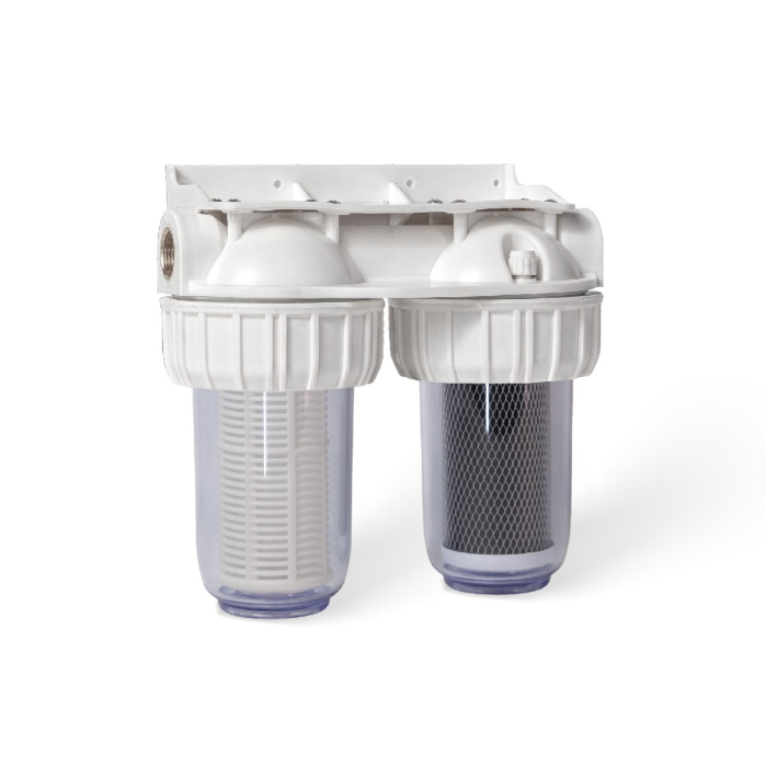 Filtre de apa AQUAQUBE 2 x 5” cu 1/2” in linie pentru filtrare mecanica cu 2 cartuse filtrante - nylon + carbune activ